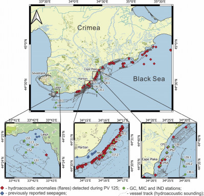 Malakhova T.V., Makarov M.M., Khurchak A.I., Stetsiuk A.P., Kucher K.M., Syrbu N.S., Legkodimov A.A., Ivanov M.V., Budnikov A.A. Shallow gas seeps offshore Crimea (Black Sea): Mapping, bubble flow quantification and geochemical study // Regional Studies in Marine Science. 2025. - V. 89. - p. 1-14. DOI: 10.1016/j.rsma.2025.104290