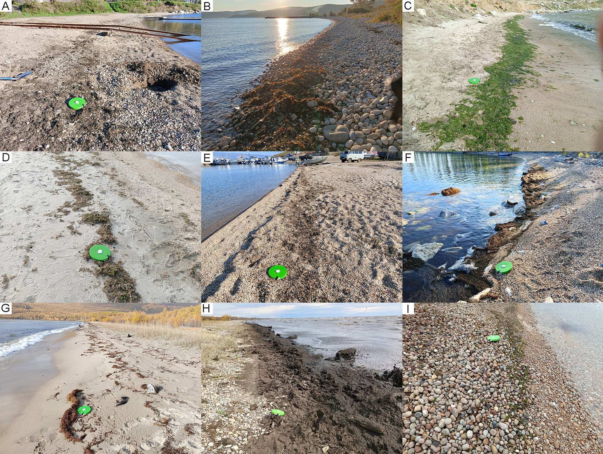 - сбор данных по береговым растительным выбросам (БСД) в районах их массовых скоплений, как косвенного показателя продуктивности фитобентоса прибрежной зоны;